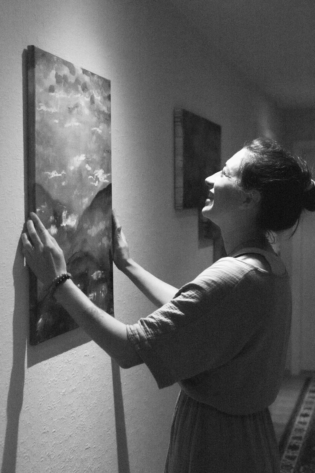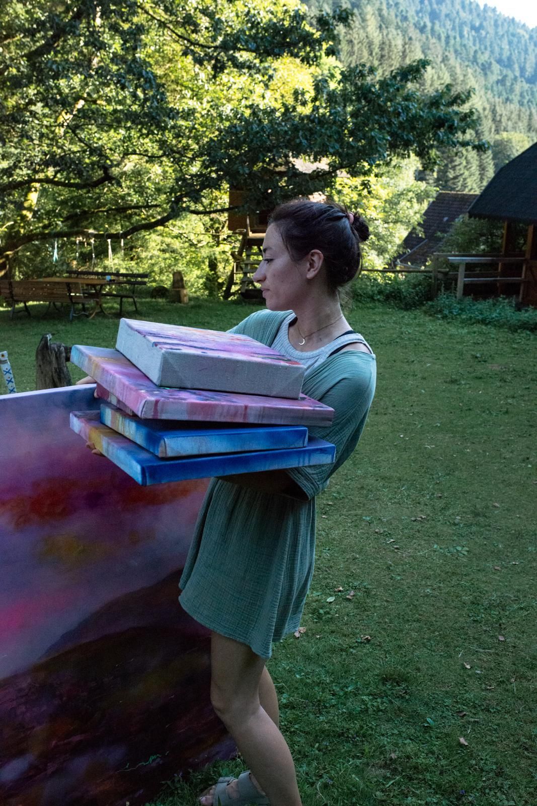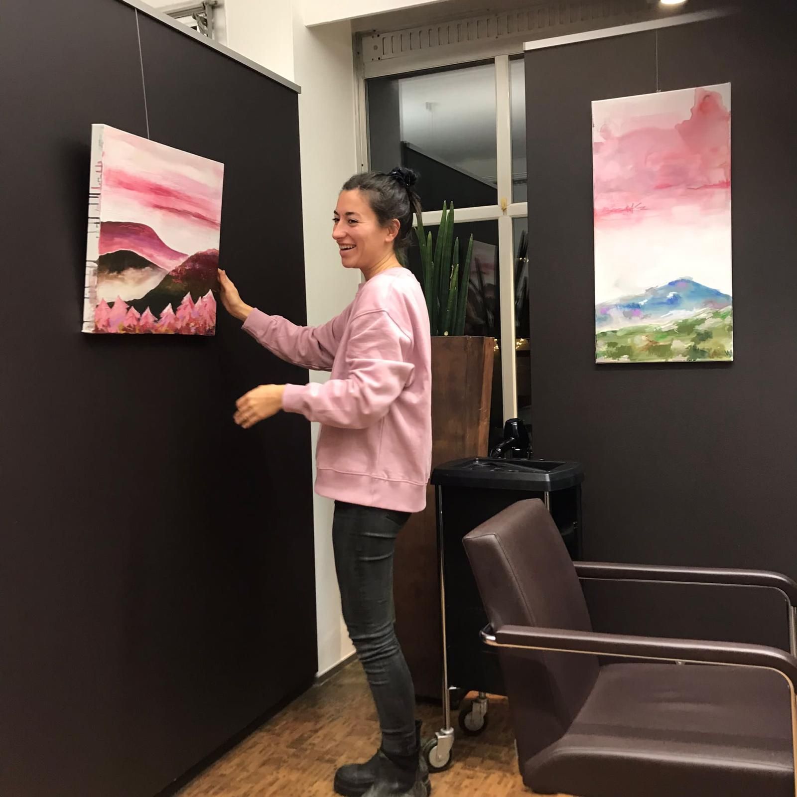 Das Aiple hat eine lange Tradition, deshalb war es wichtig einen Bezug zur Heimat herzustellen. Entstanden sind abstrakte Bilder auf teilweise Holzgründen und Aquarellpapier, welche verschiedene Schwarzwaldlandschaften zeigen. Eine Aquarellarbeit war jedoch besonders wichtig - die Vorderseite des Gasthaus Aiple in historischem Zustand.